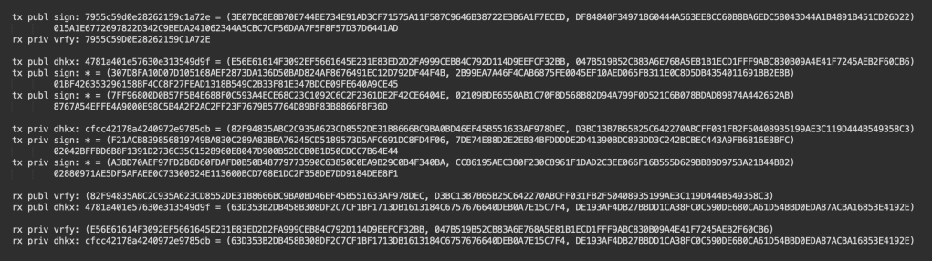 - You can see near the end there are two lines labelled “rx …. dhkx:” which contain the same shared X & Y points on the EC curve which were encrypted using the basic scheme above!