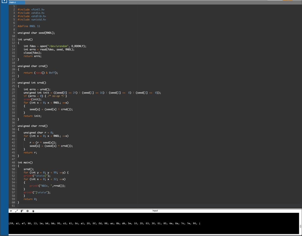 This example code will first load in 88-bits worth of /dev/urandom data into an initial seed variable which will then feed the first 32-bits into the srand() algorithm seed. Then the regular rand() function can be used to mix in the generated random data into the seeded random data to create a new stream of random output data to be used by the application.
