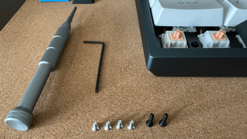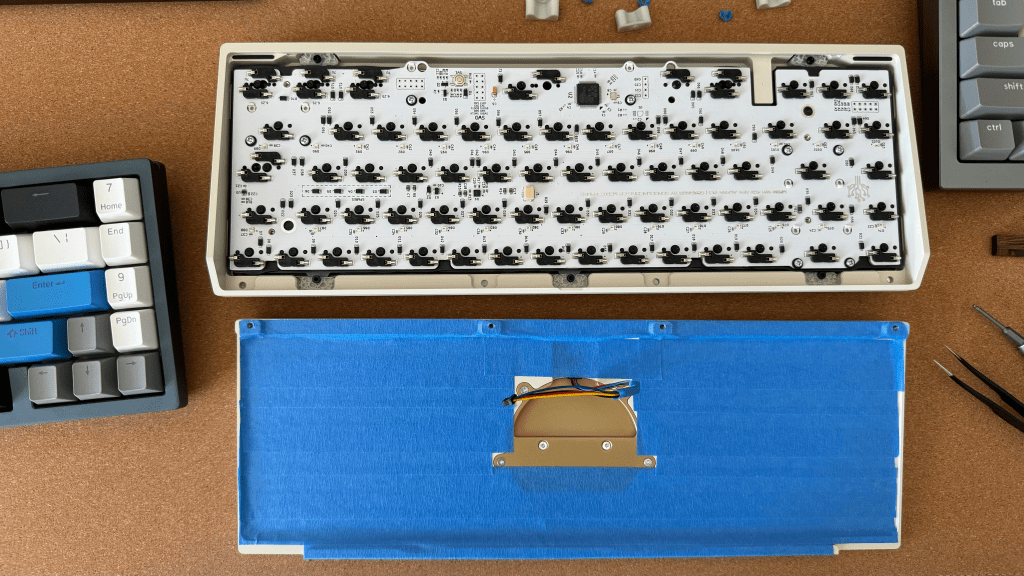 I then performed some modifications to try and lower the tone and clack of the board. I swapped out the top mount blocks and modified the full lattice blocks by cutting the tops off of them and poking holes through them so that they could be used in a top mount configuration and cushion the longer M2x8 replacement screws (force break top mount). I then taped up the bottom case to reduce the harsh metallic sounds and soften and lower the tones as well (force break bottom case).