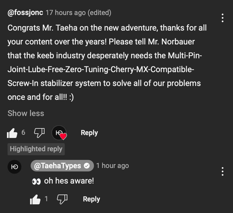 Result: It’s like a Clunky and Thunky type of deeper lower end Clack and Chalk kind of sound profile. After similar mods were done to my OG Mode Sonnet, it sounds very similar, in addition to my old original Drop Alt but in a better and more elegant case and frame. It reminds me of an old school analogue mechanical typewriter sort of sound and it made me realize that that type of sound is what I prefer as it reminds me of something real from back in the day (nostalgia?) versus aiming for thock which doesn’t really remind me of anything other than a more artificial type of muted and foamed up sound profile (although still pleasant to my ear). This is def my fav keeb so far! π