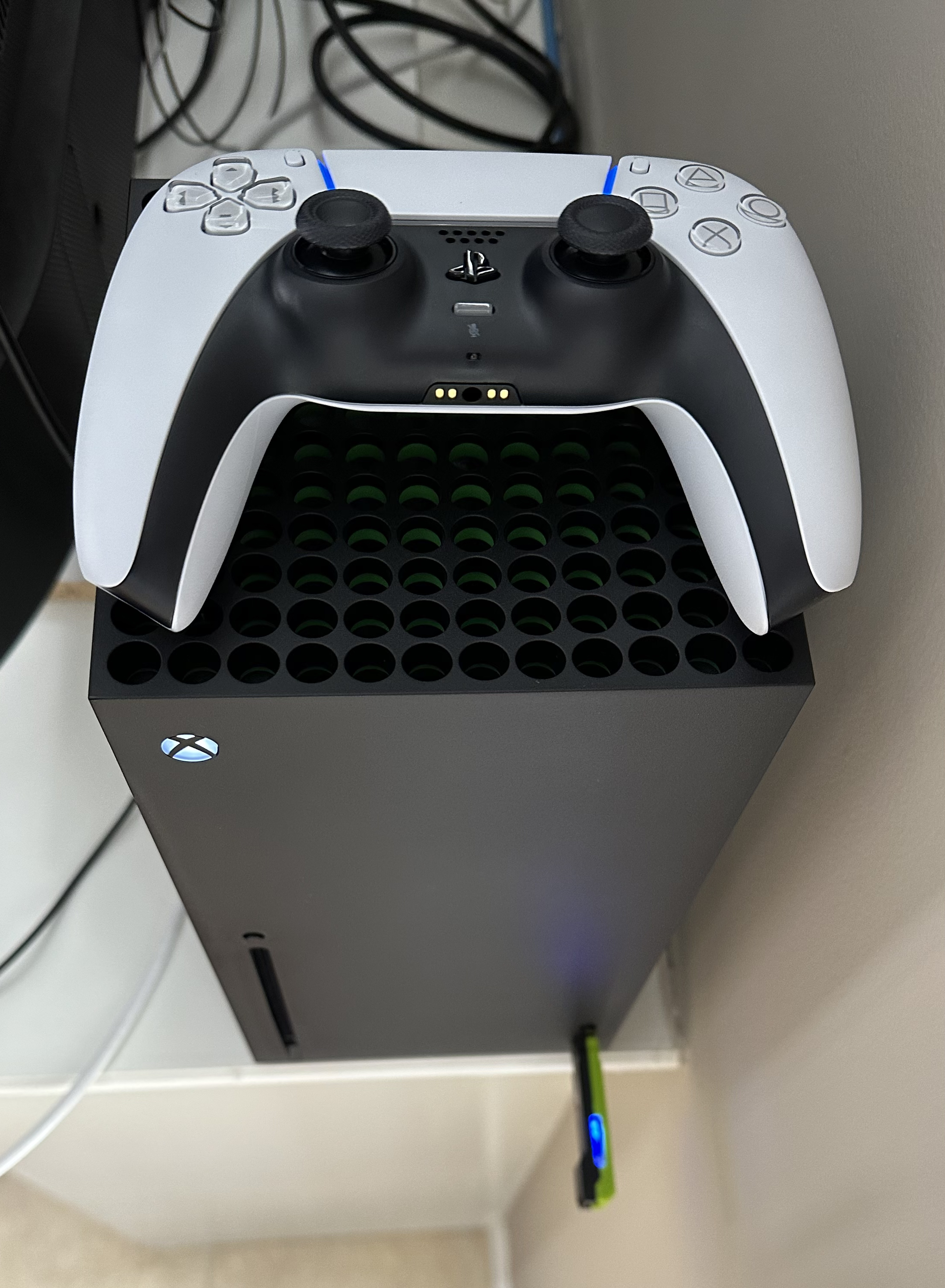 The PS5 is fairly big and bulky, the fan blades are way too small sized and it doesn’t really have proper ventilation holes or airflow direction – and according to my online searches, other people have also been facing power / heat issues with it. The only downside to the Xbox is that I highly prefer the PS5 controller over it as the bumper/trigger buttons are less bulky, the joy-sticks are symmetrically aligned, the D-Pad is in the proper location and the overall feeling/comfort is much nicer while holding it. I was even able to buy a little add-on attachment for the Xbox that allows me to still continue to use the PS5 controller which is amazing!